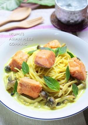 ![]() フライパンにオイルをひき、鮭をカリッと焼く。表面に火が通ったらしめじを入れて炒める。具材をよけて中央でペーストを炒める。
