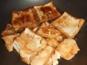 ![]() フライパンを熱し、油を薄くひき(1.)を焼き色がつくまで両面焼く。片面焼いて裏返したら(1.)で残ったタレもすべて入れる