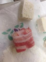 ![]() 豚肉を豆腐に巻いて行きます。 縦と横2枚使って巻きましょう。巻き終わったらおにぎりを作るようにキュッと握ります。