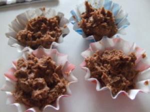 ![]() 型に入れ、中に板チョコを1~2かけずつ入れる。オーブン弱で17~20分焼く。
