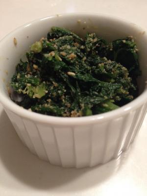 ボールにすりごま、砂糖、酢、醤油をあわせて春菊と和えて完成!
