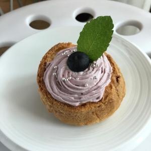 シューの器に4のクリームを詰めブルーベリーやミントの葉、アラザンなどで飾る。