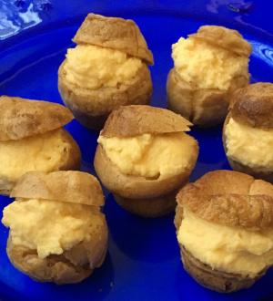 シューを1個ずつ、上から1/3くらいの位置で切り分け、カスタードクリームをつめる |