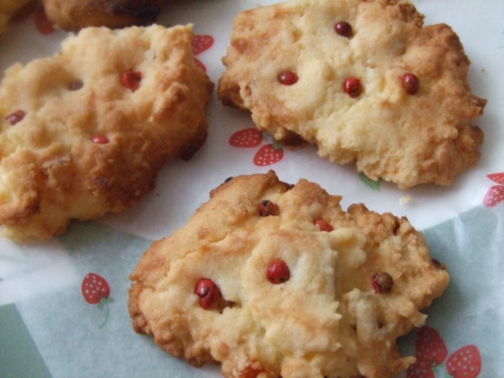天板にクッキングシートをしき、スプーンですくった生地を乗せ、ピンクペパーをトッピングする。