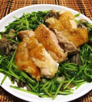 鶏肉をひっくり返して、クレソルをパラパラと振り、もう片面を焼きます。皮をパリパリに仕上げたい時は蓋をせずに中火で5分。