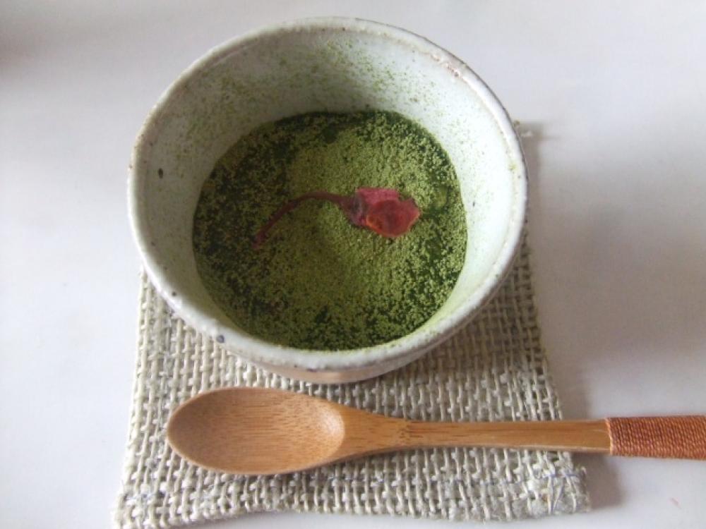 冷ました(1.)を器の底に敷きつめ、上から(2.)を入れ、冷蔵庫で冷やす。食べるときに抹茶(分量外)を上から振る。