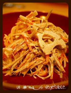 ゴマを荒めにすり、ボウルに根菜、ゴママヨネーズを入れて和える。