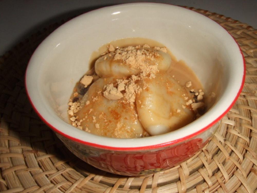 白玉を器に盛り、練りゴマをたっぷりかけ、上から同量の黒蜜をかけ、きな粉をふる。
