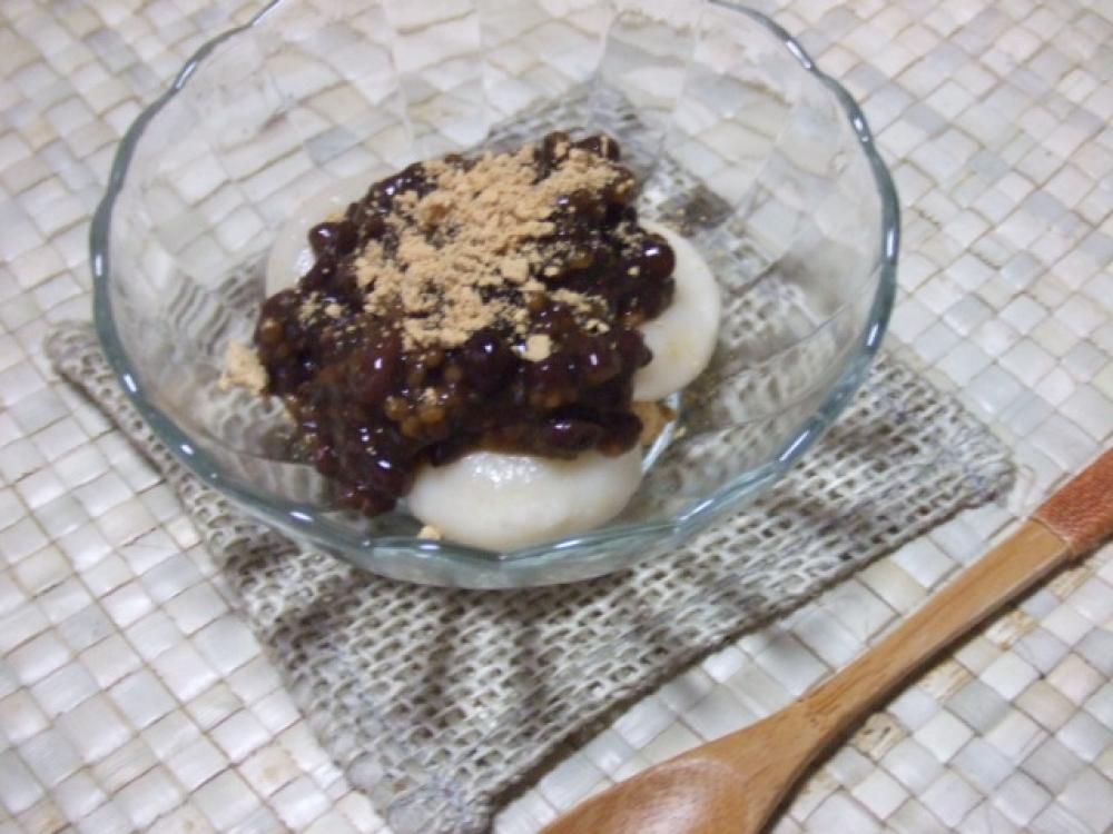 白玉粉と豆腐、砂糖を混ぜ、耳たぶの固さまでこね、沸騰したお湯に丸めて入れ浮き上がってから1~2分待ち、冷水の中に取りだす