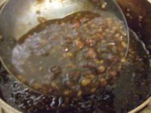 ![]() 小豆の鍋にもちあわともちきびを入れ、10分程度煮て余分な水分を捨て、黒糖を加えて混ぜながら、軽く煮る。