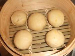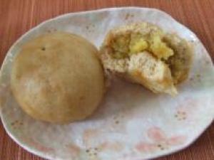 ![]() 芋あんを丸めて、(3.)で包み、形をととのえ、蒸し器で10分ほど蒸す。