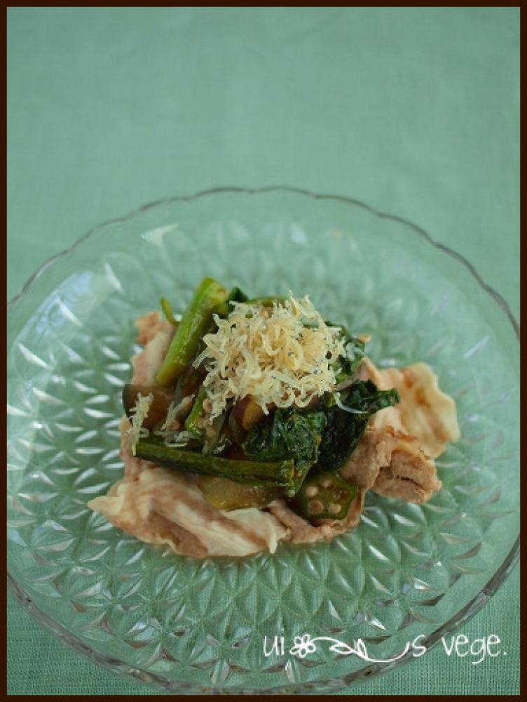 ナスに火が通ったら、つるむらさき・オクラを加えてサッと炒め、酒・生姜を加えて炒め最後に麺つゆを加えて炒める。