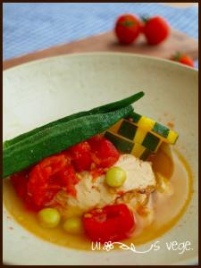 真鯛は半分に切り4枚にし、野菜はオクラ・プチトマト以外は食べやすい大きさに切っておく。枝豆はサヤから出しておく。