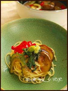 パスタを茹でて冷水で冷やし野菜と絡めて出来上がり。