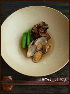 器に舞茸、小松菜を並べアサリを入れて上から出汁をかけて出来上がり。
