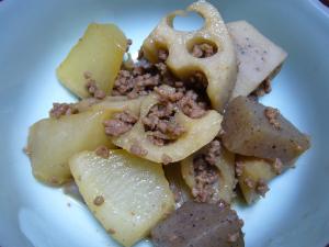 鍋にごま油を熱し、ぽろぽろになるようひき肉を炒める。れんこん・だいこん・こんにゃくを加えさらに炒める。