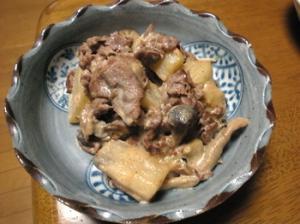 サラダ油で牛肉をほぐしながら炒め、続けて長いもとしめじを加えてさっと炒め、更に水を加えます。