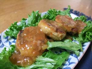 お皿にサニーレタスをしいておからのハンバーグをのせ、ソースをたっぷりとかけたら出来上がり。