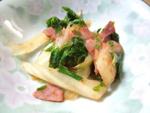 ベーコンを熱湯にくぐし、一口大の大きさに切り分けます。