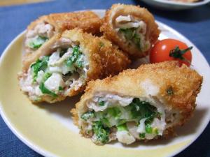 卵、小麦粉、パン粉をまぶして油でカラッとキツネ色に揚げたら出来上がりです。
