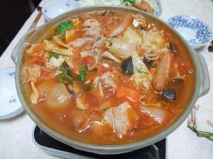 土鍋にホールトマト・水・コンソメの素・塩コショウ(適量)を入れ、火にかけます。