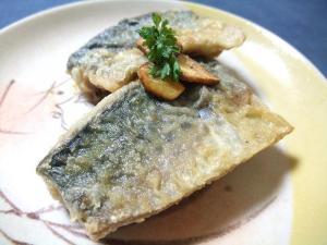 塩コショウをしたサバに小麦粉をまぶし、フライパンに加えニンニクと一緒にこんがり焼き上げます。