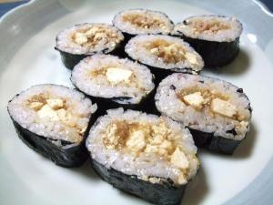 簀巻きの上に海苔をしき、その上に雑穀米をしき、麻婆春雨豆腐ををのせて巻いたら完成です。