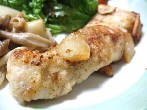 塩コショウをした真鱈に小麦粉をまぶし、フライパンに入れ、ニンニクと一緒に炒めたら完成です。