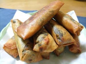 春巻きの皮の中心に韓国海苔をしき、麻婆春雨豆腐をのせて包み、油でカラっと揚げたら完成です。