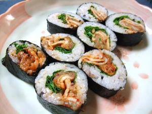 簀巻きの上に海苔をしき、その上に雑穀米をしき、サニーレタスと豚キムチをのせて巻いたら完成です。