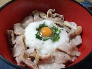 ごはんの上に刻み海苔を敷き、丼のふち沿いに豚とブナピーをのせます。