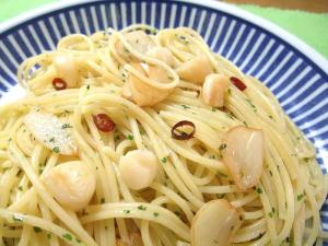 水気をしっかり切ったパスタと真珠貝の貝柱を加えて、オリーブオイルと混ぜ合わせます。
