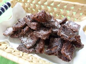 パンミミをオーブンで焼いて、湯煎で溶かしたチョコレートを絡めます。