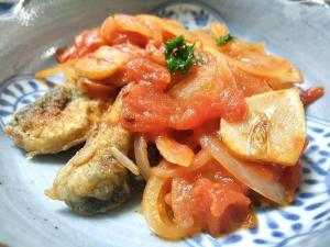 ニンニクに火が通ったら、イワシを入れて両面をこんがりソテーしたら、イワシを取り出します。