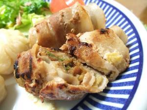 豚バラ肉にテンメンジャンを塗り、蒸したキャベツ・ほうれん草を巻きます。