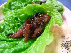 ごま油・XO醬・刻みねぎとまぜ合わせて、サンチュで巻いたら出来上がりです。