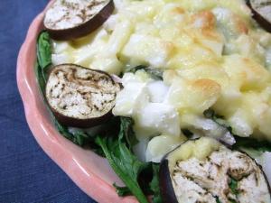 耐熱皿に塩コショウをしたほうれん草をしき、チーズとなすをのせて180℃のオーブンで約10分焼きます。