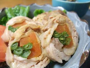 ラップの上に鶏もも肉を広げ、エリンギ・えのき・にんじん・いんげんをのせて巻き、ラップでくるみます。