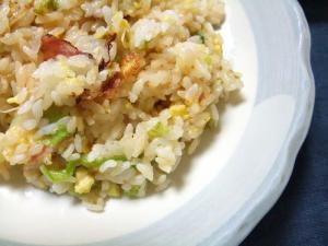 熱したフライパンに油をひき、溶き卵とベーコン・長ネギ・しらすを入れてかき混ぜます。