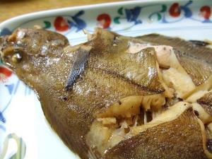 調味料を鍋で煮立て、切込みを入れたカレイを入れて、落し蓋をして煮付けます。
