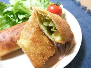 春巻きの皮に蒸したキャベツ・チーズ・味噌マヨをのせて巻いて油でカラッと揚げたら出来上がり。