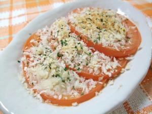 トマトをスライスし、パルメザンチーズ・塩・パン粉・パセリをふります。