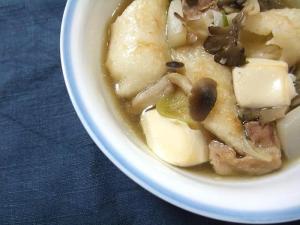 豆腐は角切りに、長ネギは斜め切りに、きりたんぽは適当に切ります。