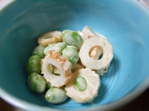 茹でた枝豆と小口切りにしたちくわを、マヨネーズと醤油で和えたら出来上がり。