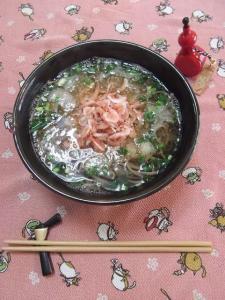 器にめんつゆ&蕎麦を入れ、大根おろし&桜エビ&万能ねぎをのせたら出来上がり