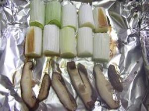 ![]() 長ネギ・椎茸はアルミホイルにのせて軽〜く塩してトースターで7〜8分焼いて焦げ目を付けます。