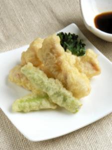 とり肉、アスパラをてんぷら粉に付けて、カラッと揚げる