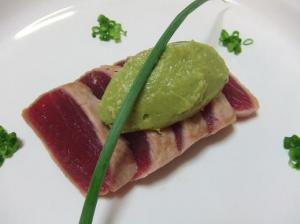 食べる時に赤身を切って器に盛り、アボカドクリーム&万能ねぎをトッピングして出来上がり!