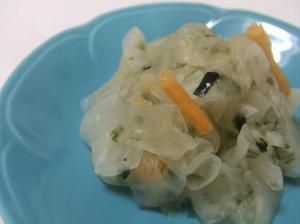 ビニール袋などに、かぶ&お茶漬け海苔の素を入れて、ぎゅうぎゅうモミモミします。