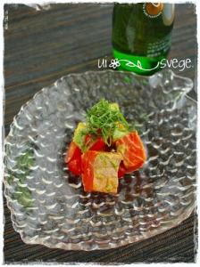 サーモンに塩・胡椒で下味を付ける。アボガドは小さく切り柚子の果汁を絡めておく。プチトマトは半分に、大葉は千切りにしておく